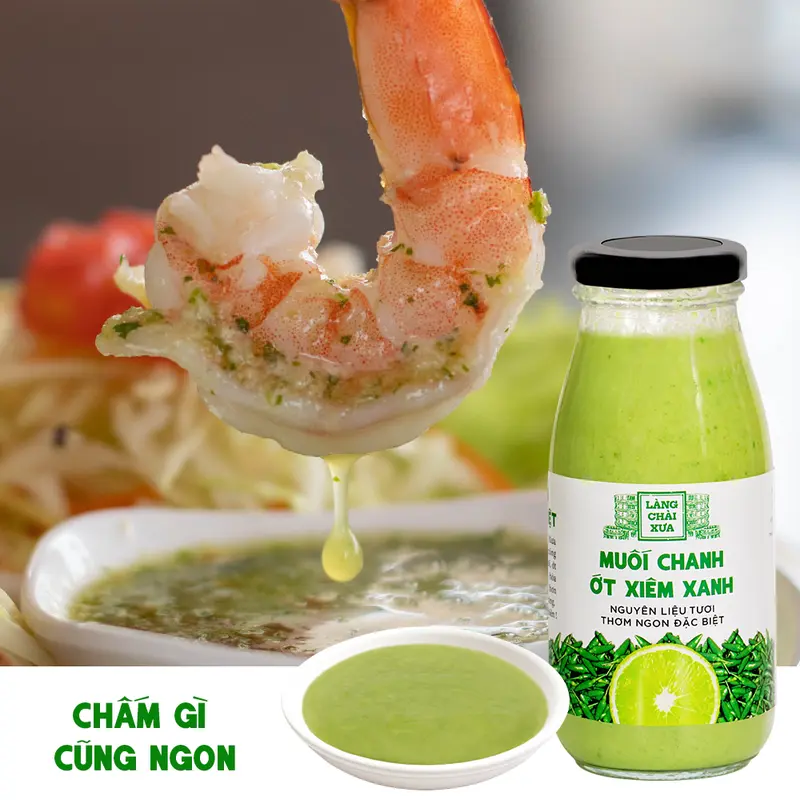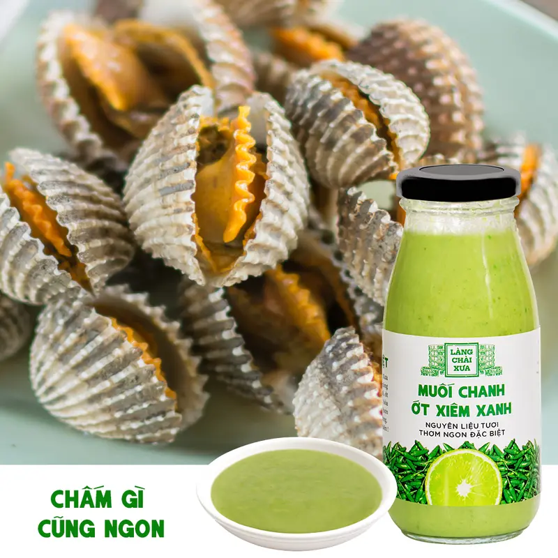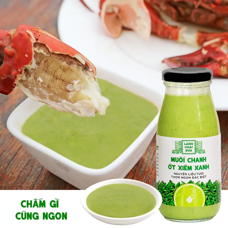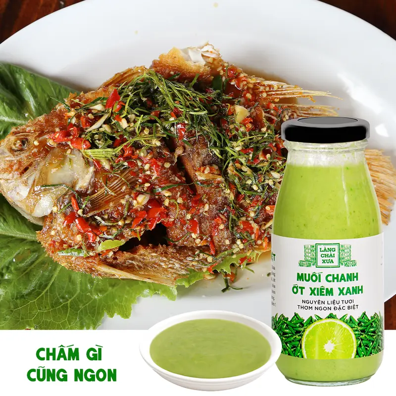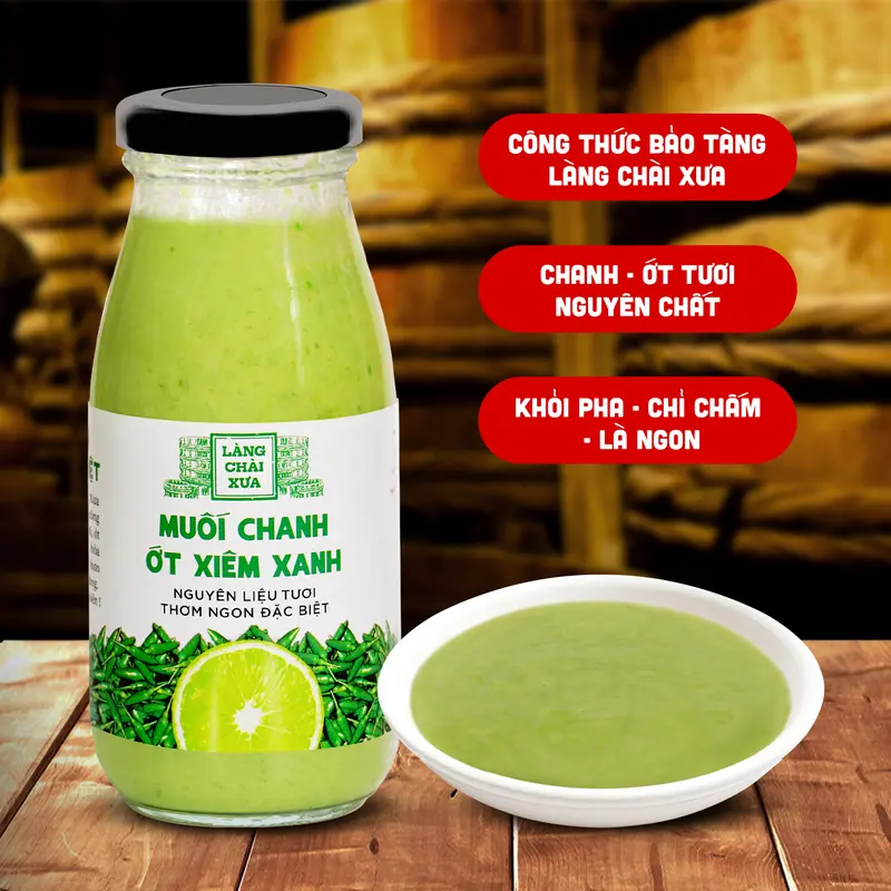 Muối chanh ớt xiêm xanh Làng Chài Xưa rất thơm ngon và khác biệt, được làm công phu bằng nguyên liệu tươi. Chanh tươi, ớt xiêm tươi và muối sạch tinh khiết hòa quyện nồng nàn giúp món ăn ngon hơn rất nhiều, đặc biệt là hải sản hấp, nướng.