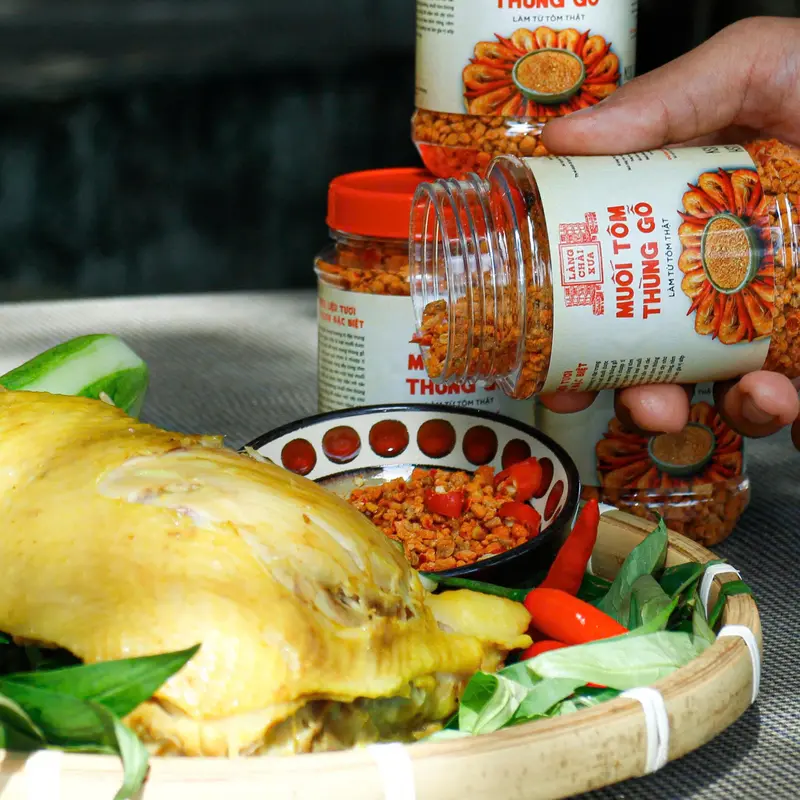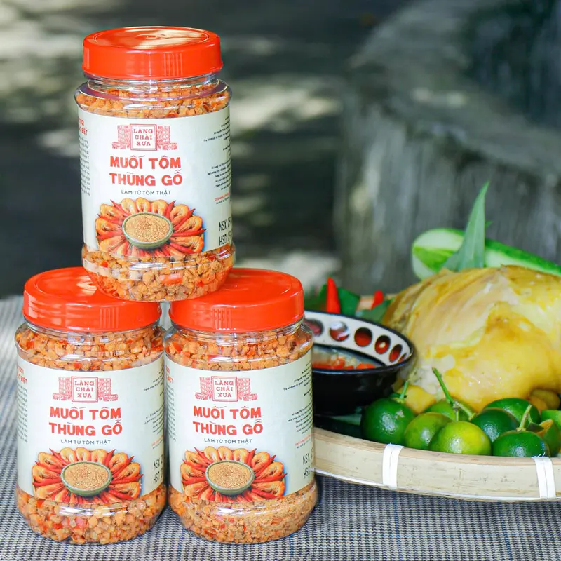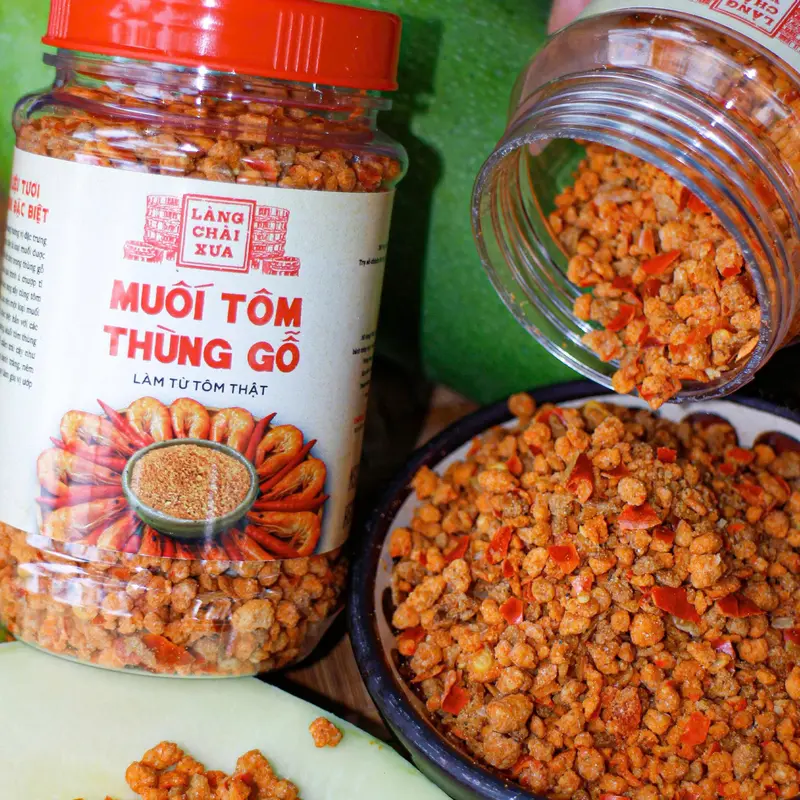 - Muối tôm thùng gỗ Làng Chài Xưa rất thơm ngon, muối kết tinh từ thùng lều gỗ truyền thống, trải qua quá trình ủ chượp nước mắm tỉ mỉ. Những hạt muối được rang sấy cùng tôm khô và gia vị chọn lọc, tạo nên một loại muối chấm đậm vị biển cả, khác biệt hẳn với các loại muối tôm thông thường.