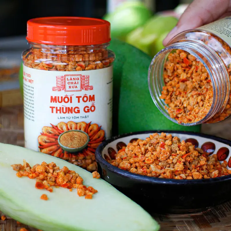 - Muối tôm thùng gỗ – làm từ tôm thật – hạt muối kết tinh trong thùng gỗ ủ nước mắm rang sấy cùng tôm khô và gia vị chọn lọc.