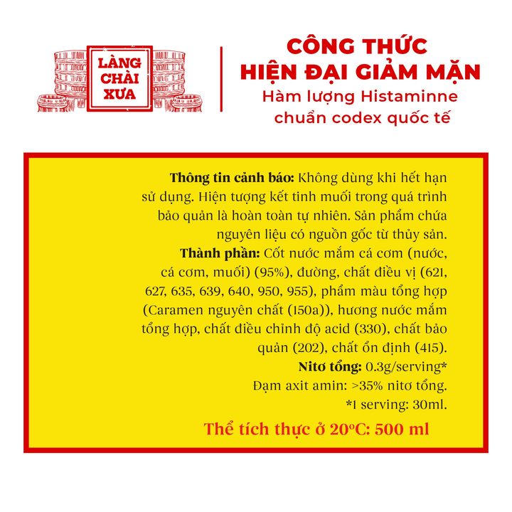 – Nước mắm Làng Chài Xưa chai đã điều chỉnh theo công thức giảm mặn hiện đại, vẫn giữ cốt mắm truyền thống, chỉ dùng 1% điều vị và 0.1% chất bảo quản – rất thấp so với mức phổ biến trong nước ép hay nước ngọt và đều thuộc danh mục an toàn của Bộ Y Tế.
