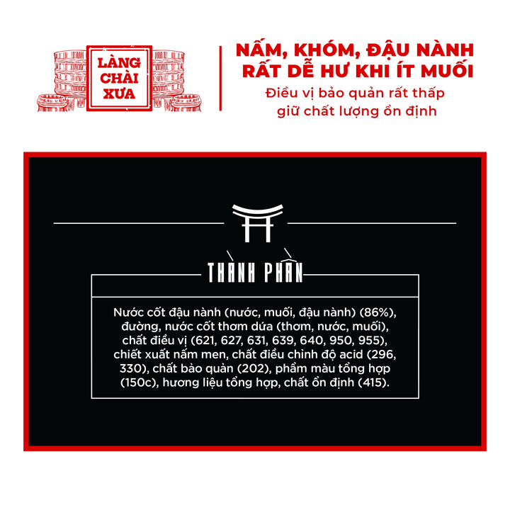 - Các dòng mắm chay và nước tương thương hiệu Làng Chài Xưa và Shiitake (chai nhựa và chai thuỷ tinh) đã được điều chỉnh giảm mặn cho dễ dùng hơn, nên có dùng 1% điều vị và bảo quản để giữ được lâu, đặc biệt với nguyên liệu tươi như nấm, thơm, đậu nành rất dễ hư khi ít muối. Tất cả đều dùng trong giới hạn cho phép của Bộ Y Tế và đảm bảo an toàn.